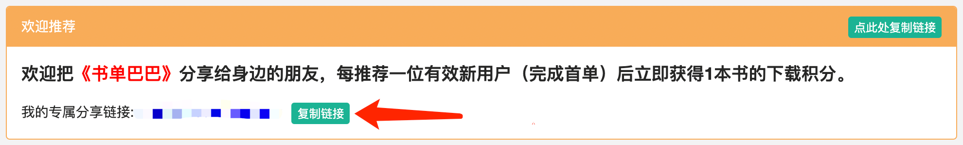 每推荐一位有效新用户(完成首单)立即获得一本书的下载积分,只要分享链接在,就一直会产生免费下载的积分啦......